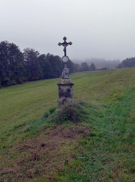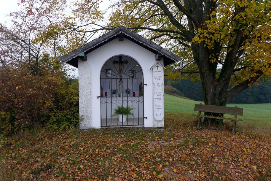 Bei Vorderherberg biegen wir links ab und treffen schließlich auf eine kleine Kapelle mit einer Totenbrett-Gruppe. Die Bank lädt zum Rasten und Reflektieren ein. Ausgeruht halten wir uns rechts Richtung Hinterherberg, das wir jedoch bereits an der ersten Kreuzung nach links auf einen Feldweg verlassen. Diesem folgen wir 300 Meter, dann wandern wir rechts weiter am Waldesrand. Es geht bergab. Ein weiteres Mal kreuzen wir die Ohe und lassen einen kleinen Bauernhof linkerhand liegen. Während wir den Fluss noch drei weitere Male auf unserem Weg nach Euschertsfurth überqueren, geht es wieder merklich bergan.