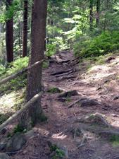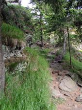 Der Goldsteig Markierung folgen wir bergab zum Kleinen Riedelstein, wo es sich lohnt am Gipfelplateau zu verweilen.  Auf einem Forstweg erreichen wir schließlich den Ecker Sattel (Einkehrmöglichkeit im Berggasthof Eck).