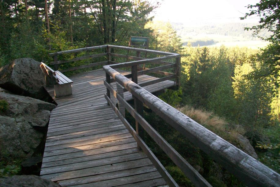 Schließlich wird’s wieder steiler und über Wurzelpfade führt der Pandurensteig durch die Höhen des Waldgebirges auf den Kamm des schroff geformten Wagensonnriegels. Beim Gipfelkreuz (990 m) mit Kapelle genießt du einen herrlichen Ausblick auf die vordere Bergkette des Bayerischen Waldes.