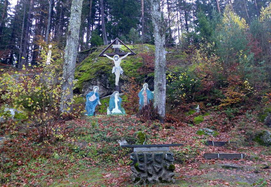 Wir umrunden den Rinchnacher Klosterkomplex via Probsteigasse und Hofmark, nehmen dann die Gehmannsberger Straße und lassen uns von der links abknickenden Bischof-Hofmann-Straße am Ortsrand entlangführen. Rechterhand folgen wir dem Erlenweg. Dieser begleitet uns durch Felder und Wiesen ortsauswärts. Am Ende der Siedlung schwenkt der Pandurensteig rechts auf einen Feldweg, der hinunter in das Tal der Rinchnach führt. Wir wandern eine Weile das Wiesental hinauf. Dann steigen wir rechts den Hang hinauf. Am Ortseingang von Gehmannsberg passiert man linkerhand die Freilichtbühne. Wir durchqueren das Örtchen. Der erste Feldweg außerhalb von Gehmannsberg führt uns rechts über Wiesen, dann durch dichten Wald hinauf zum Frauenbrünnl.