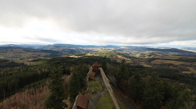 Wir überqueren die Straße und folgen einem felsigen Weg, der von Bäumen gesäumt ist und schöne Aussichten auf die Umgebung von Sušice bietet. Mit dem Eintritt in den dichten Wald beginnt ein steiler Aufstieg von ca. 1,4 km, zuerst auf einem felsigen Weg, später auf einem Forstweg zum zweiten Gipfel des Swatobor-Berglands (Svatoborská vrchovina) zum Kalovy-Hügel (727 m ü. M.). Nach 111 m vom Kalovy-Hügel, auf der Schöne Aussicht (Krásná vyhlídka), die einen Rastplatz bietet, hat man eine schöne Aussicht auf die Umgebung, aber auch auf den Aussichtsturm Svatobor. Die Stadt Sušice - das Tor zum Böhmerwald – liegt vor uns. Bei der Rückkehr von der Schönen Aussicht zum Gipfel des Kalova führt der Weg nach rechts durch einen allmählichen Abstieg auf einem asphaltierten Waldweg durch eine Lichtung in einen dichten und ruhigen Wald und rund um die Siedlung 3,1 km bis zur Straße Nr. 171. Der Weg führt weiter bergab entlang der Asphaltstraße zwischen den Häusern nach Velká Chmelná, wo auf 700 m der Radweg Nr. 313 (12, Otavská) anschließt.