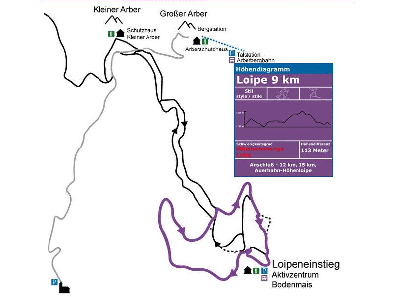 Vom Start bis km 1 leichtes Gelände, km 1 -3 welliges Gelände dazwischen eine großartige Panoramasicht über Bodenmais, mittelschwerer Anstieg bis km 4 zum Hochzellschachten, ein weiter Blick zum Arbermassiv und die Kontrollstelle für die Bodenmaiser Langlaufnadel erwarten Sie hier. Km 4 - 9 mittelschwere Anstiege und Abfahrten zum Ziel.