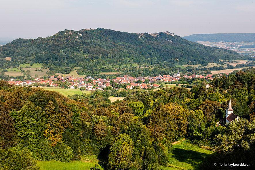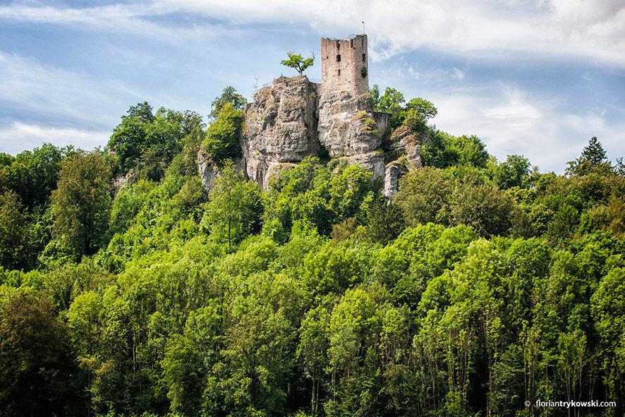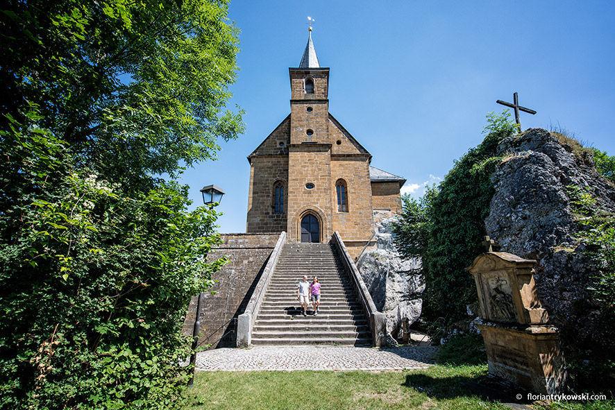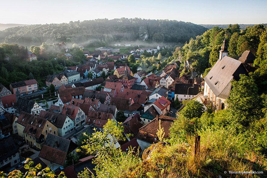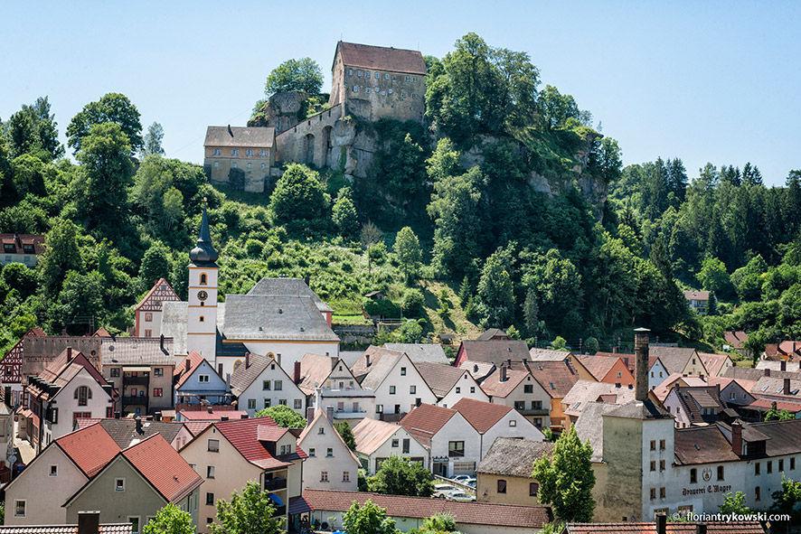 Die Fränkische Schweiz Rundtour beginnt im Vier-Täler-Ort Behringersmühle, unterhalb von Gößweinstein. Von hier aus führt die Route durch das romantische Wiesenttal flussaufwärts in Richtung Waischenfeld, wo uns der Steinerne Beutel über dem Ort grüßt.