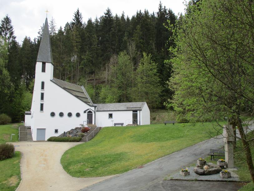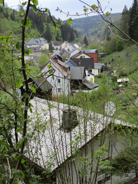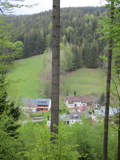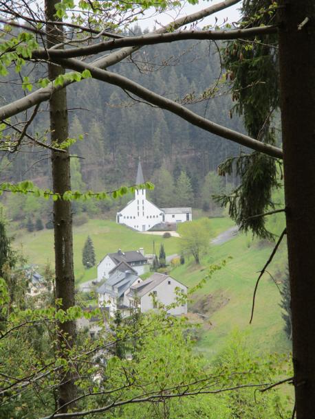 Wir wandern oberhalb des „Schwarzen Mohren" und können von oben die Dürrenwaider Kirche im Tal erkennen. Bei der nächsten Weggabelung halten wir uns nach rechts, um nach 50 m wiederum rechts in einen Hangweg abzubiegen. Dieser Weg endet mit einem Treppenabstieg kurz vor der im Jahre 1968 errichteten Christuskirche auf dem Grundstück des „Schwarzen Mohren", wo noch vor gut 200 Jahren nach Silbererz gegraben wurde.