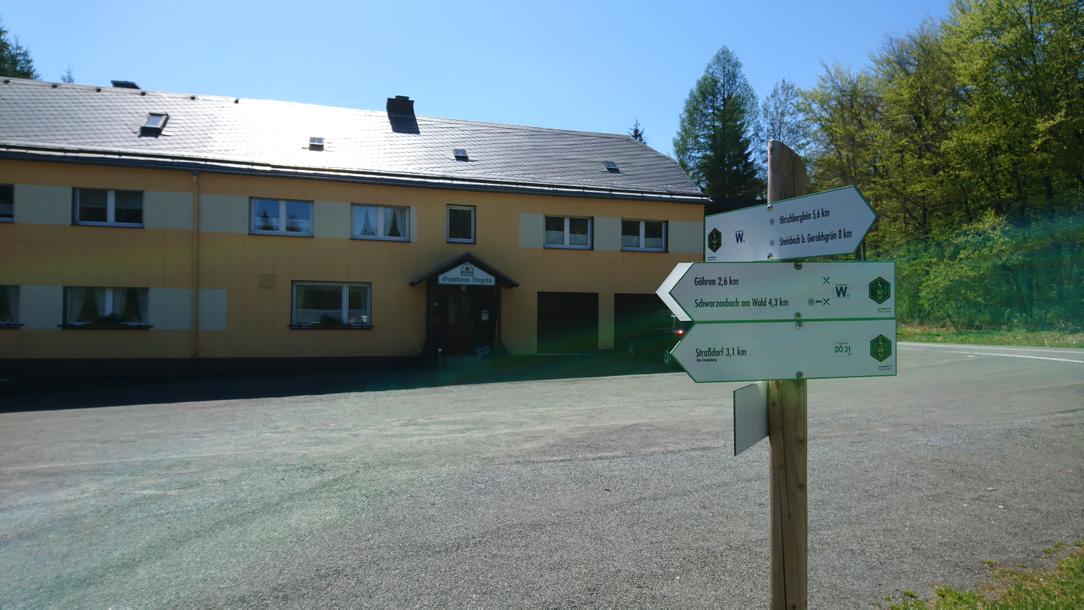 Wir überqueren am Gasthaus die Staatsstraße geradeaus, gehen nur wenige Meter auf dem Fahrweg weiter und biegen gleich nach links in den Wald ab. Nun durchqueren wir ein weites Waldgebiet durch die Waldabteilungen Auerhahnsruh und Geigenbaum mit etlichen Abzweigungen, und kommen schließlich nach einer Forststraßen-Gabelung links hinunter zum Parkplatz an der Loipe. Wir überschreiten die Straße und gehen etwa 400 m abwärts, kommen zum Geroldsgrüner FCR-Sportplatz in Geroldsreuth und laufen weiter zurück zum Ausgangspunkt in Geroldsgrün, zurück zu den Kuckuck, wie die Geroldsgrüner scherzhaft genannt werden.
