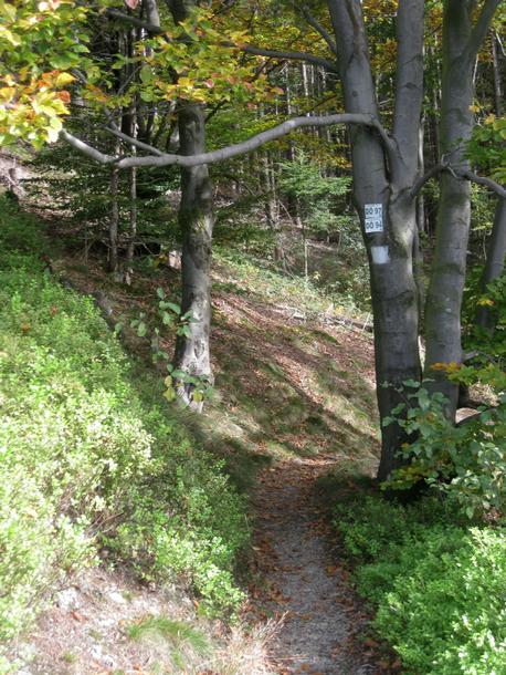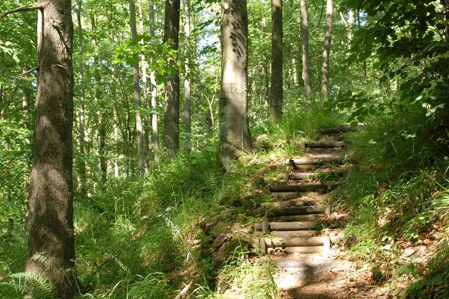 In den Dörfern der Nachkriegszeit waren die Häuser oftmals noch durch Steige miteinander verbunden, auf denen man auf kürzestem Weg zum Nachbarn kommen konnte. Ein dichtes Netz solcher Pfade, die Jägersteige, gab es damals auch noch neben den, nur durch Tiergespanne genutzten, Waldwegen in den Wäldern. Sie wurden von den „Pflanzweibern" begangen, den Holzhauern und den Forstleuten zur Revierbegehung und zur Jagdausübung benutzt, wurden aber auch gebraucht, um die Wälder abseits der Straßen beaufsichtigen zu können. Sie wurden so angelegt, dass es sich gut darauf laufen ließ. Geländemulden wurden mit Steinen aufgefüllt, an manchen Stellen in den Fels geschlagen. So wurde auch eine Trockenmauer an diesem Rundweg in Zusammenarbeit aller zuständigen Stellen wieder errichtet, damit der Weg begehbar bleibt. Heute durchziehen vorwiegend Forstwege und -straßen den Wald, die von Großmaschinen befahren werden. Die moderne Forstwirtschaft braucht keine Pfade; sie werden deshalb auch nicht mehr gepflegt, wie es früher notwendigerweise geschah. So wie die Pfade in den Dörfern, die Schul- und Kirchsteige zwischen den Dörfern sind auch die Jägersteige vielfach verschwunden. Nur noch auf Teilstrecken von Jägersteigen wandern wir heute gerne, wo einst der Herr Oberförster mit Pfeife, Dackel und Flinte des Weges zog.