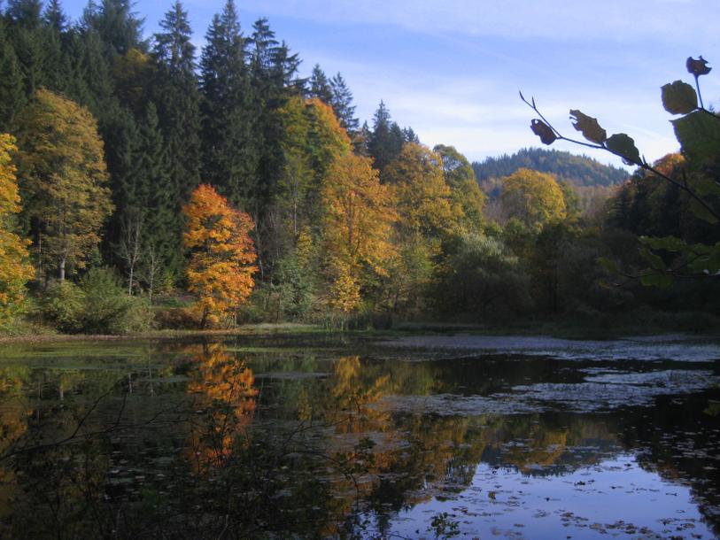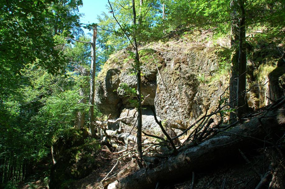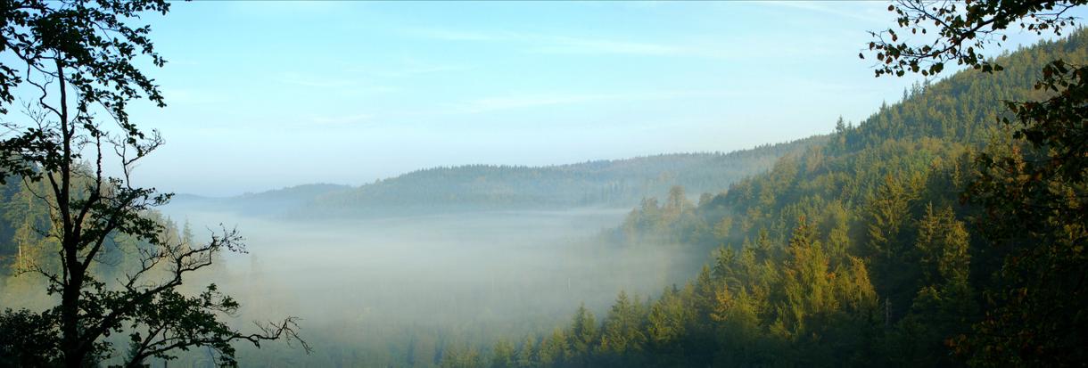 Nach dem Abstecher folgen wir der Forststraße weiter, queren die Straße und wandern den Hang aufwärts zum Kämmleinsfelsen mit einer beeindruckenden Aussicht. Tief unten das ehemalige Langenauer Forsthaus mit dem Floßteich, am Horizont (9 km entfernt) der Aussichtsturm bei Birnbaum. An der Schutzhütte vorbei, erreichen wir auf einer Forststraße den höchsten Punkt unserer Wanderung. Wir laufen links weiter und biegen nach 400 m nach rechts auf einen Jägersteig ein, der uns durch die Buchenwälder des Grießbachgrundes und dann wieder zurück zu unserem Weg führt. Wir verlassen ihn schon nach 50 m wieder nach links hinunter zu einem Jägersteig und erreichen mit ihm den Aussichtsfelsen Schwammerling, direkt über dem Forsthaus Langenau. Nun ist es nur noch ein Katzensprung zurück zum Ausgangspunkt.