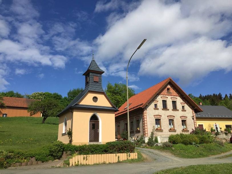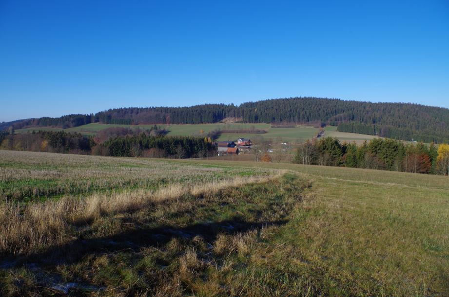 In dieser neu renovierten Kapelle auf dem Dreischelberg (Traischelberg), gestiftet 1930 von einem Auswanderer aus der Papiermühle, werden jährlich kirchliche Veranstaltungen (Maiandacht, Waldweihnacht, Bittgang, Wallfahrt) abgehalten. Auf der Straße (keine Alternative) kommen wir über die Senke, einen urwüchsigen Talgrund, die "Höll", aufwärts nach Oberehesberg an der Fränkischen Linie, wo uns eine herrliche Aussicht (auf das Obermainische Bruchschollenland mit Rugendorf im Tal, Feldbuch und - links- auf Poppenholz und das weite Umfeld) dafür entschädigt. Wir gehen geradeaus durch den Ort und werden am Ortsrand von einer phantastischen Aussicht auf das Fichtelgebirge überrascht.