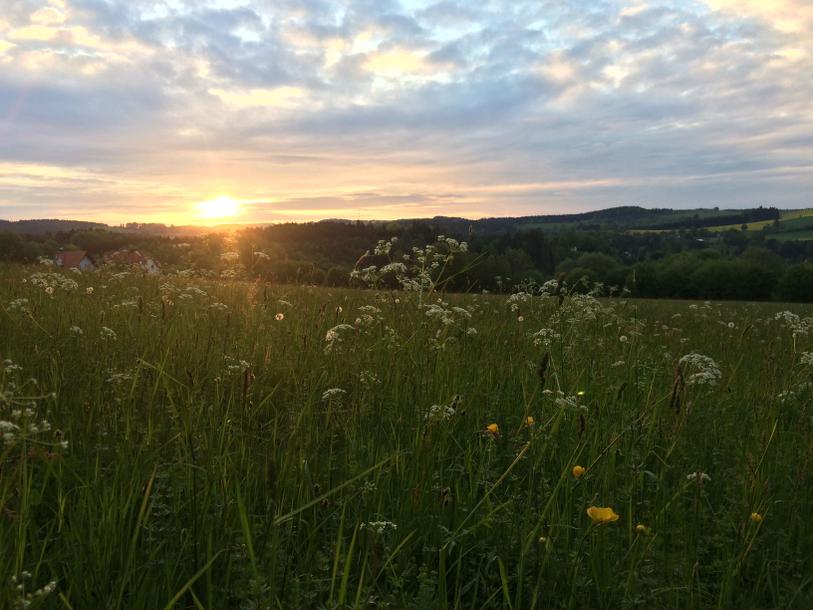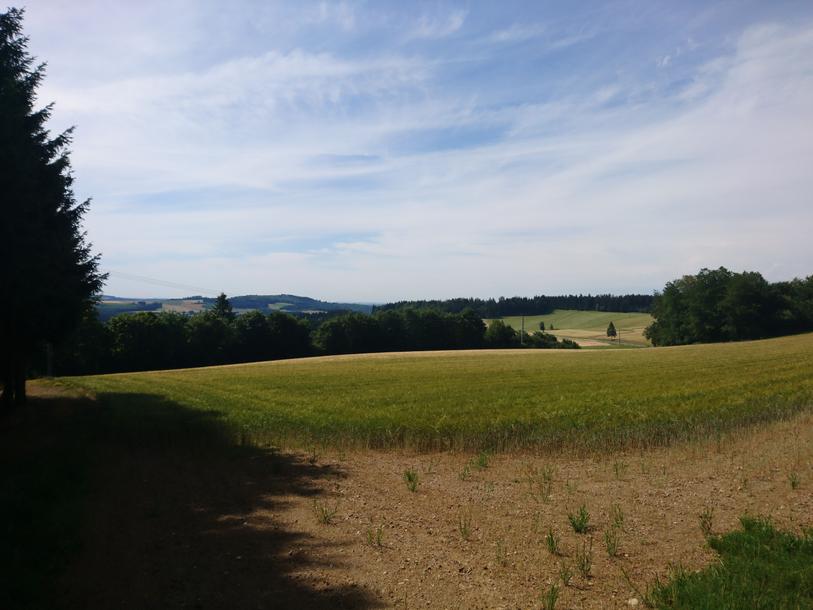 Wir starten in dem idyllisch am Hang des Zettlitzbaches gelegenen Kirchdorf Wartenfels mit den vielen Bildstöcken und Kreuzen im Umfeld. Wir bewundern die Dorflinde (Naturdenkmal) an der Kirche und gehen aufwärts zum Sportplatz und dann am Trainingsplatz vorbei auf einem naturbelassenen Feldweg beständig durch abwechslungsreiche Fluren aufwärts. Schöne Ausblicke, auch auf die Kapelle auf dem gegenüber liegenden Waldhang, begleiten uns bis zur Ortsverbindungsstraße.