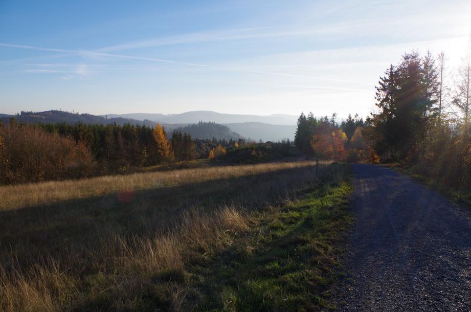 Wir wandern am Ortsende auf der Straße an Leitschenstein vorbei in Richtung Neufang, überqueren den alten Floßbach und das Tal und laufen auf einem Hangweg nahe des Tales aufwärts zur Höhe der Leitschmühle.
