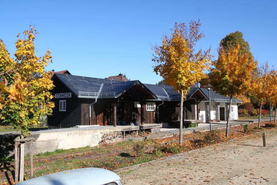In der Industriestraße – vorbei an der Kreuzkapelle, an Kleingartenanlagen, parallel zur Eisenbahnstrecke – der Straße Am Gries und der Flößerstraße kommen wir zum Baierwehr, das noch an die Zeit erinnert, als Steinwiesen ein bedeutender Flößerort war. Das Wasser des Wehres wurde sowohl in den Mühlgraben für die Schneidmühlen abgeleitet, als auch von den Flößern genutzt. Wir überqueren die Rodach auf dem Wehrsteg und folgen der Markierung bis zum Informationszentrum des Naturparks im Bahnhof von Steinwiesen. Die neu gestaltete Infoeinrichtung befasst sich mit dem Thema "Kulturlandschaft des Frankenwaldes". Gemeinsam mit dem Flößerweg gelangen wir von hier zurück zum Ausgangspunkt an der Touristinfo in Steinwiesen, dem anerkannten Erholungsort.