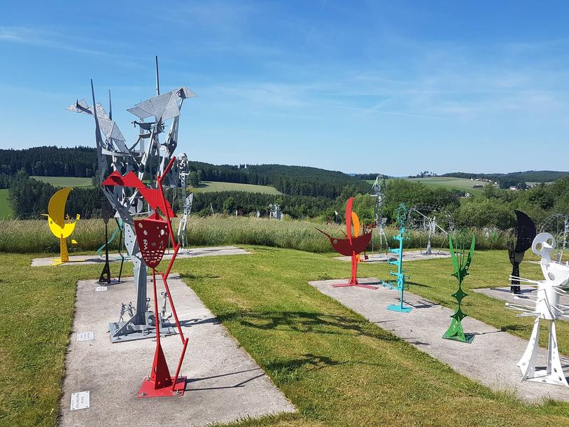Wir erreichen die beschauliche Ortschaft Eisenbühl. Wir folgen der Kirchgasse in den Ort und biegen an der Hauptstraße rechts ab um nach 50 m die Straße zu überqueren und in die Schieferleite einzubiegen. Zusammen mit dem Schiefersteig (US 74) verlassen wir den Ort und erreichen den 1997 errichteten Eisenpark, der zum Verweilen einlädt.