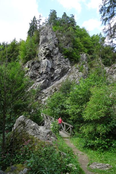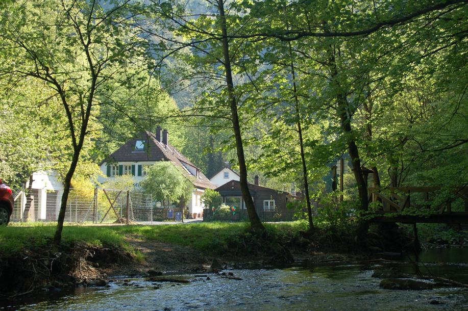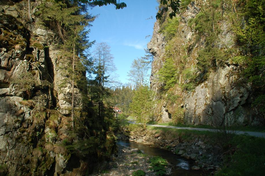 Der bequeme Weg führt zur Straße, der wir vorbei am Pestwurz überwucherten Rauschbachtal zur Neumühle folgen. Der Rauschbach mündet drüben in den Rehbach; beide bilden die Steinach. Während der Mühlenweg durch den Hof der Ausflugsgaststätte nach links abzweigt, folgen wir noch kurz der Straße, verlassen sie dann geradeaus und wandern über eine weite, offene Talfläche. Während von der Höhe die Häuser von Wildenstein grüßen, laufen wir auf dem kleinen Damm zur Steinachklamm und gleich auch zum Waffenhammer. Den Untergrund dieses Wegestückes bildet das Gestein des weggesprengten Felsenteiles, der erst vor knapp 100 Jahren die Fortführung des Weges durch dieses einst enge Felsentor ermöglichte. Die Steinach und ihre Quell- und Nebenflüsse trieben ehemals 25 Mühlen an. Es waren Mahl-, Schneid-, Papier- und Pulvermühlen. Eine Sage erzählt die Entstehung der Klamm. Am Fuße des Teufelssteins (594 m) wechseln wir nach dem Waffenhammer mit dem Standbild des Eulenspiegel.