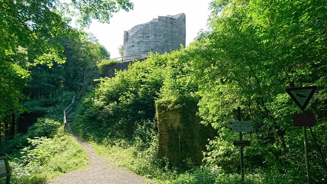 Mauerreste und der Stumpf eines einst mächtigen Rundturmes erinnern an eine Burg, die 1525 von aufständischen Bauern niedergebrannt wurde. Wir wandern in weitem Rechtsbogen auf einem Waldweg leicht abwärts. Aus dem Talgrund grüßt uns die Steinach und die dem Verfall preisgegebene vormalige Papiermühle. Kurz vor dem Ortsschild stoßen wir wieder auf die Talstraße. Wir kommen bei der Schneidmühle am Hochofen vorbei. Der 1865 eingerichtete Betrieb hat bis heute Bestand. Durch eine Renovierungsmaßnahme 1982 der Fachhochschule Düsseldorf und mit der Unterstützung einheimischer Handwerker konnte ihre Funktion erhalten bleiben. Zu bestimmten Zeiten und Anlässen wird hier noch Holz geschnitten. Weiter auf der Straße, kommen wir auf der rechten Seite zum ehemaligen königlichen Berg- und Hüttenamt. Bis 1846 war der Untere Hammer Bergamt. 1834 wurde der Hochofen ausgeblasen.