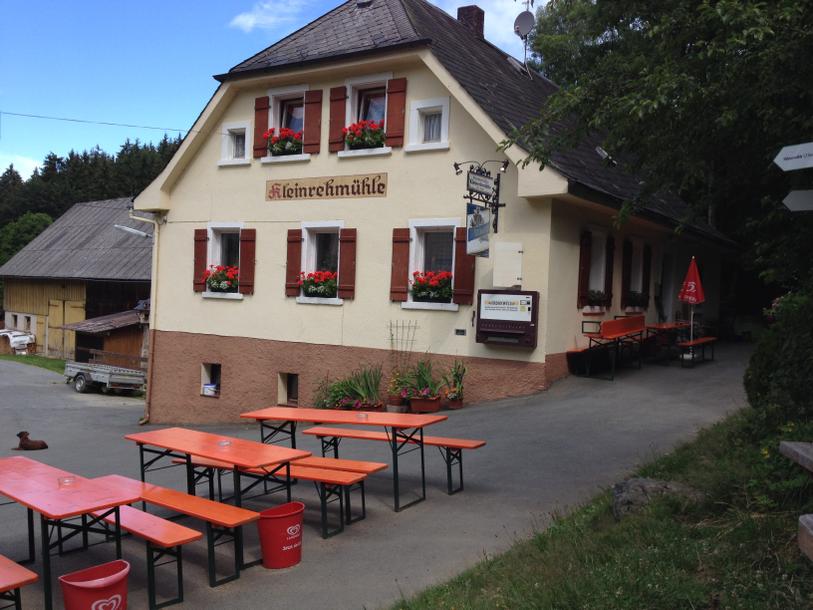 Wir laufen im Wald lange durch verschiedene, meist mit jungen Fichten bestandene Waldbestände dem Vollaufbach folgend, bis zu der über die nach Grafengehaig führende Straße. Wir überqueren sie geradeaus und überschreiten dann auf einem Steg den Rehbach und das enge Tal des Rehbaches zum Waldrand hinüber. Links aufwärts steht die, dem Verfall preisgegebene, Gaststätte (60 Betten) Großrehmühle, die 1683 erstmals als Schneidmühle erwähnt wurde. Ziemlich lange, meist leicht abwärts wandernd, kommen wir im dichten Fichtenwald auf einem angenehmen Waldweg bis kurz vor die Mehlthaumühle Wir sehen aber die am Hang des Rehberges gegenüber liegende vormalige Mühle, wenn wir ohne Markierung kurz geradeaus weitergehen. Wir biegen aber schon am Waldende nach links ab und laufen über eine Wiese zur Höhe empor. Dort gehen wir nach rechts, am Waldrand bergab, kurz nach rechts durch den Wald zur Kleinrehmühle.