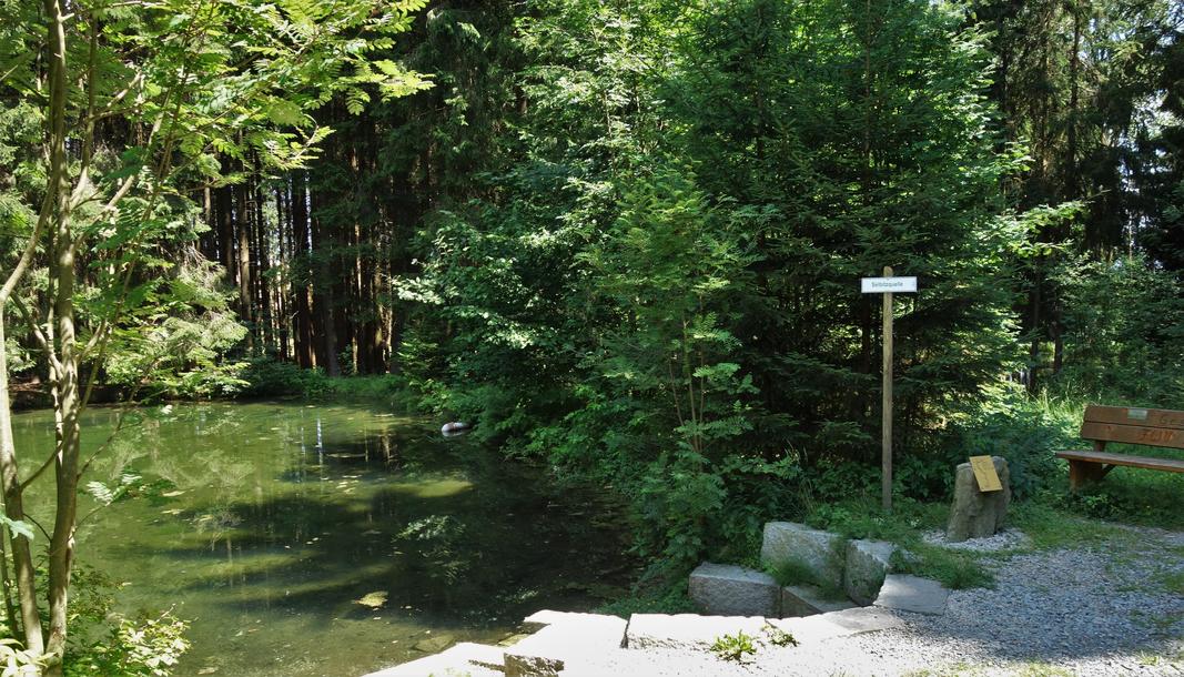 Wir laufen die Kulmbacher Straße ortsauswärts und zweigen im nahen Unterweißenbach in der Ortsmitte nach rechts ab und laufen in südwestlicher Richtung an einem einzelnen Anwesen vorbei zum Wald und dort weiter bis zur Kreisstraße. Wenn wir nun der Straße kurz nach links folgen, und dann nach rechts in einen Feldweg abbiegen, freuen wir uns über den Blick zum Fichtelgebirge, der vom Kornberg über den Waldstein und den Schneeberg bis zum Ochsenkopf reicht. In der Nähe grüßen die drei Windräder von Marktschorgast. Wir laufen durch schön gestaltete Fluren und schließlich ziemlich lange im Wald, bis wir auf die von Ort kommende Straße stoßen. Von dieser Kreisstraße aus biegen wir nach rechts in einen Feldweg zum Wald ein. Bald danach bietet sich ein empfehlenswerter Abstecher nach links zum Teich am Quellgebiet der Selbitz mit dem Zulauf des Quellwassers an.