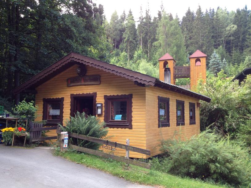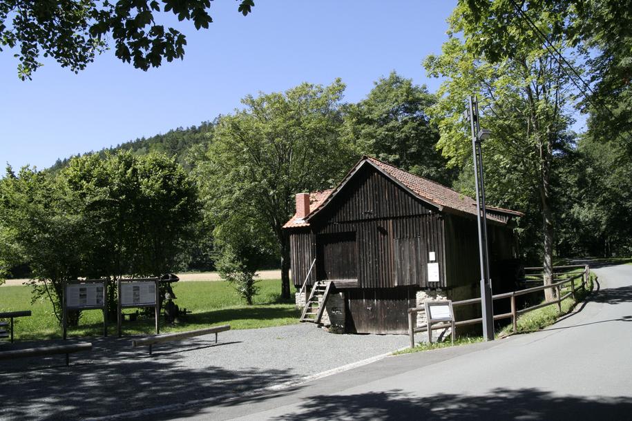 Die Wanderereinkehr (ehemals zeitweise Wagnerei, Brotbackstube) stellte 1931 den Mahlbetrieb ein. Die Straße abwärts gelangen wir bald wieder im Tal zum Guttenberger Hammer. Die Familie Krumpholz besitzt den einstigen Eisenhammer seit 1799 und stellt heute mit neuzeitlicher Technik Geräte und Werkzeuge für die Forst- und Landwirtschaft her. Auf dem Fahrweg wandern wir nach links, überqueren den Rehbach und kommen an der Hübnersmühle vorbei. Sie wurde zum Schluss zu nur noch als Schrotmühle betrieben. Der Sägewerksbetrieb wurde bereits 1936 eingestellt.