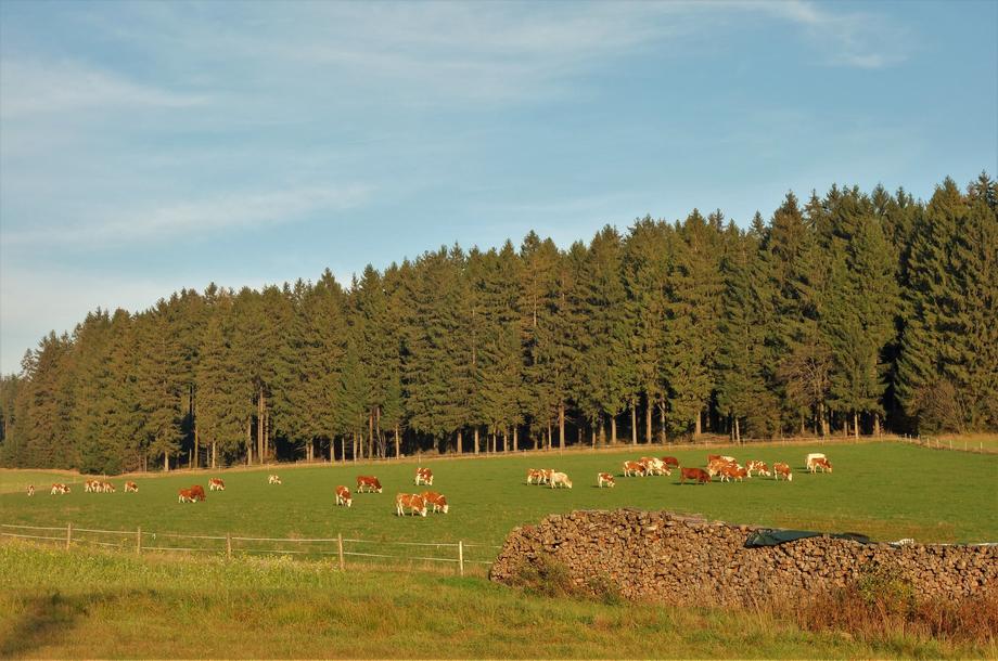 Wir gehen auf naturbelassenen Waldwegen weiter, freuen uns über die Durchblicke auf Kriegsreuth, zur Streusiedlung Rappetenreuth und zur Straße. Die Streusiedlung wird durch das Grenzbächlein zwei Kommunen (Helmbrechts und Grafengehaig) zugeordnet. Früher stießen hier die Herrschaftsgebiete Schauenstein, Guttenberg und Kupferberg zusammen. Wir folgen der Straße kurz nach rechts, um dann auf einen Feldweg nach links abzubiegen. Mit ihm gelangen wir an einer Feldscheune vorbei im Wald aufwärts zu einer kleinen Anhöhe. Dort wandern wir scharf nach links und erreichen durch Wald einen Wiesengrund. Wir biegen auf einem Wiesenweg nach links ab und gleich darauf wieder nach rechts und folgen ihm durch die Flur mit schönen Ausblicken an den Ortsrand des idyllisch gelegenen Dorfes Horbach.