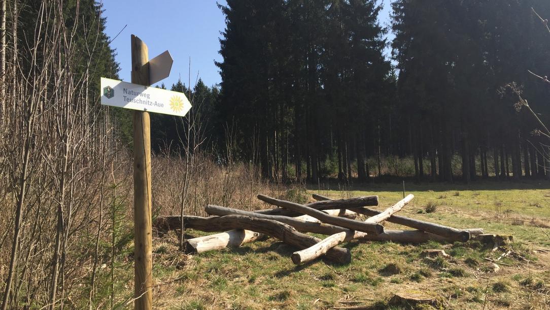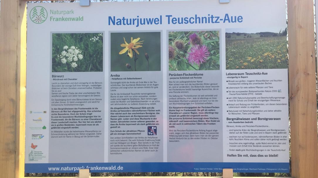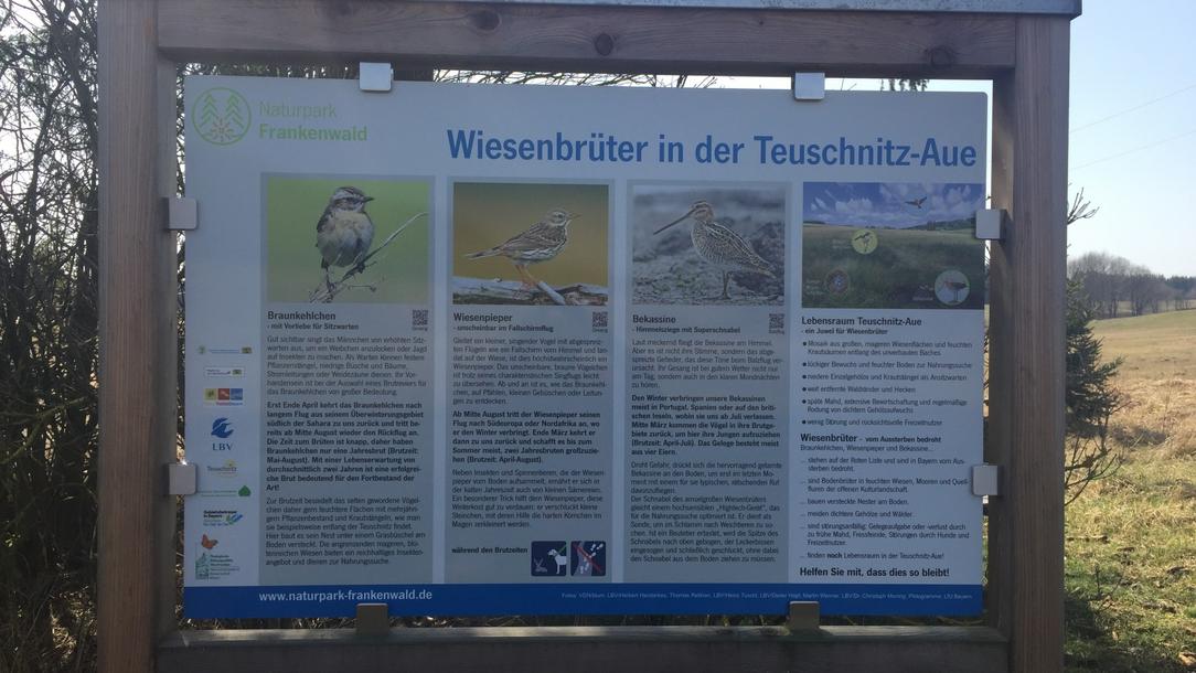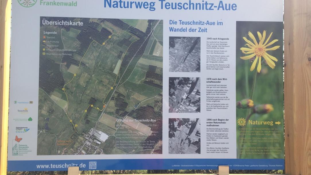 Um Ihnen die Besonderheiten der Landschaft der Teuschnitz-Aue bei dieser kleinen Wanderung zu erklären, entdecken Sie am Wegesrand neun kleine Markierungen mit Symbolen und QR-Codes Mit Hilfe einer Broschüre, die am Ausgangspunkt erhältlich ist, können Sie an diesen Punkten interessante Erläuterungen zu Natur und Landschaft erfahren.