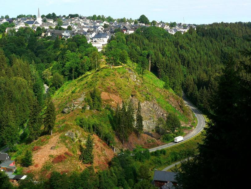 Hier hat man wiederum mehrere Sehenswürdigkeiten kompakt beisammen: Die katholische Pfarrkirche St. Bartholomäus (tagsüber geöffnet), den Kirchhof mit dem Kirchbrunnen (Moses vor dem brennenden Dornbusch), gegenüber das imposante Kriegerdenkmal (1925), die ehemalige Fronfeste, das alte Amtshaus der Vögte, den „Bübla-Brunna“ (Steinfigur mit Schiefertafel und Griffel), den ehemaligen Marktplatz entlang der Straße mit Forsthaus und Rathaus. Vorbei an Einkehrmöglichkeiten führt dann der Weg entlang derLobensteiner Straße und der Amlichstraße zurück zum Ausgangspunkt.