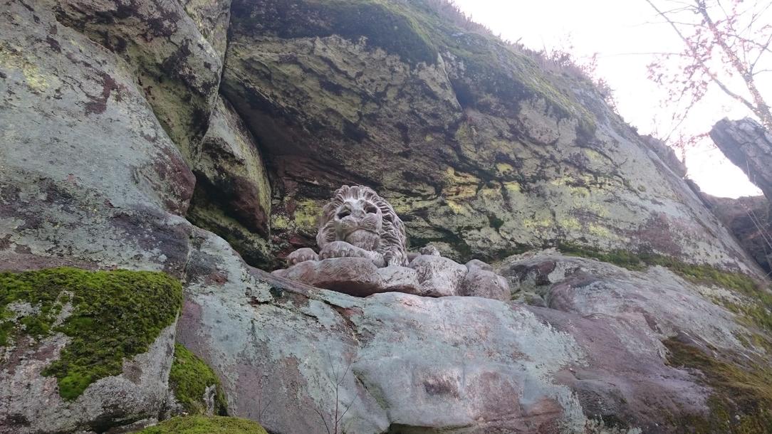 In einer natürlichen Grotte rechts oben in einer Felsenwand ist ein fast lebensgroßer Löwe aus Stein zu sehen. Das 1907 errichtete Denkmal erinnert an Freifrau Annie von Würtzburg, geborene Lyons (lion/englisch = Löwe). Die angesehene Familie führte einen Löwen in ihrem Wappen, ihr Vater war Oberkommandant der englischen Flotte. Seit ein Hangrutsch den Weg zu diesem Wahrzeichen zerstörte, ist ein Zugang nicht mehr möglich. Am Ortseingang wenden wir uns nach links und erreichen unseren Ausgangspunkt, den Parkplatz am Wasserschloß, nach Überquerung der Föritz, die unweit davon in die Steinach mündet.