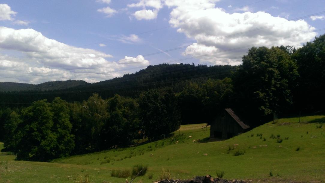 Etwa 300 Meter verlaufen unsere drei Wanderwege parallel zur Bundesstraße am Schwarzen Teich vorbei, bevor sie nach links dem Waldrand folgen. Der Forstweg führt uns den Fuchsberg hinan, bis wir an einer Kreuzung den uns begleitenden Rundwanderweg KC 33 nach rechts ziehen lassen, dafür aber vom KC 31 (Häusles Weg) nach links in Richtung Häusles begleitet werden. Durch den Wald steigen wir hinauf und erreichen in einem Buchenwald ein Gattertor, das wir wieder hinter uns schließen. Wir verlassen den Wald und sehen zur Linken ein sich bis ins Tal ergießendes, umzäuntes Damwild-Gehege und vor uns die Gebäude von Häusles mit der Gastwirtschaft „Schäferstuben“. Von der Terrasse der „Schäferstuben“ aus hat man einen herrlichen Blick über den Wald, das Tal und das Treiben im Damwild-Gehege.
