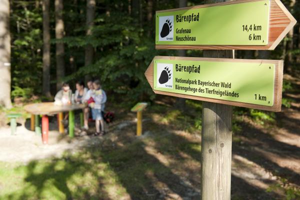 Die 2. Etappe auf dem Bärenpfad führt von der Kleblmühle durch den Wald und mit Blick auf den Lusengipfel nach Schönanger, wo eine Bären-Kräftemess-Station auf euch wartet.