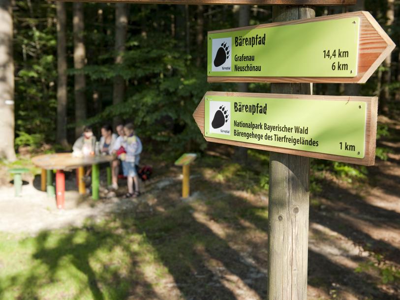 Etappe 1Ihr habt Lust, wandern einmal ganz anders zu erleben und die Natur aus den Augen von zwei kleinen Bärenbrüdern zu sehen? Dann nichts wie los zur Erlebnistour auf dem Bärenpfad. Zwischen Grafenau und Schönanger endecken kleine und große Wanderrer spannende Erlebnisstationen rund um das Patentier der Stadt Grafenau. Besonders geeignet ist der Weg für Familien mit Kindern, die unterwegs auf spielerische Art und Weise viele Informationen übe rden Bären sammeln können.