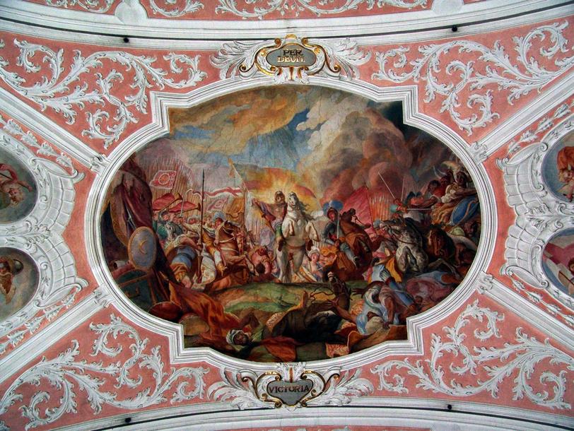 dem barocken Kloster und dem mächtigen Turm der Pfarrkirche St. Jakobus.