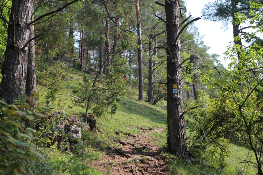 Westlich des Marktes Schmidmühlen nimmt der Jurasteig seinen Weg zunächst über einen schmalen Pfad den Blaugrund hinauf. Recht wild schlängelt sich ein wildromantischer Weg durch einen naturnahen Mischwald, bis die Route auf der Anhöhe wieder relativ eben durch den Wald führt. Vor Erreichen des Dorfes Winbuch bietet der Jurasteig schöne Ausblicke über die wellige Landschaft. Nach Winbuch führt die Route zunächst weiter über offene Flur, bis der Weg talwärts wieder durch schattigen Wald führt.