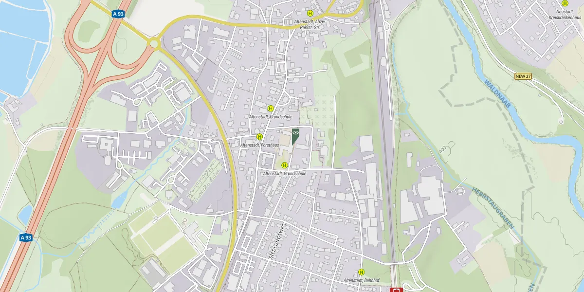 Der Wanderweg Goldene Straße verläuft zwischen Grundschule und Kindergarten der Gemeinde Altenstadt a.d. Waldnaab auf der sogenannten "Goldenen Gasse" und zeigt an einer 50 Meter langen Wand des Schulgebäudes den Verlauf des alten Handelsweges von Kaiser Karl IV., der vor 650 Jahren von Prag nach Nürnberg führte.