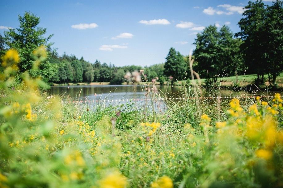 Kurz vor Schnelldorf weist der Wanderweg abwärts und erreicht nach dem Wald im Talgrund den idyllisch gelegenen Erlensee.