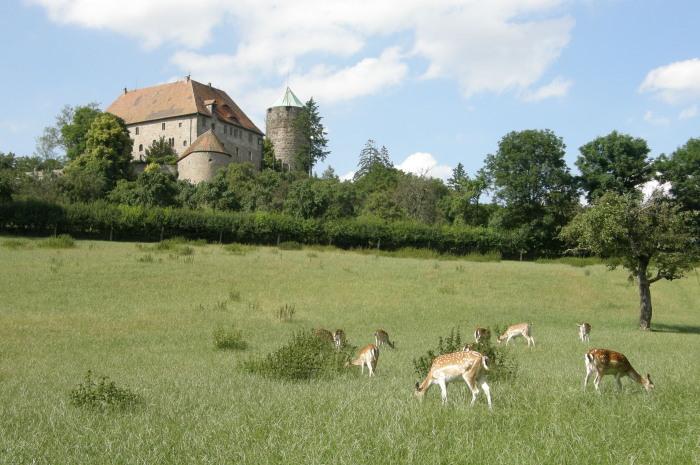Sie können auch der schwarz-gelben Markierung des Rundweges Wasserscheide folgen und erreichen dann über einen sehr schönen Waldweg die kleine Straße, die zum Badeweiher und zum Golfplatz führt. Dort können Sie auf der Terrasse einen herrlichen Blick auf die Burg genießen.