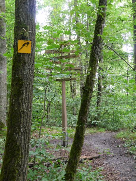 Nach der Bahn folgen wir wenige Schritte dem Fahrweg nach links und steigen durch das „Eiserne Kreuz “, den 1925 zur Erinnerung an die Gefallenen des 1. Weltkrieges angelegten Ehrenhain, zum Himmelfahrtsberg hinauf. Dort erwartet uns eine Schutzhütte mit Bank und Tisch und eine herrliche Aussicht weit in den Aischgrund und hinüber zum Steigerwald.