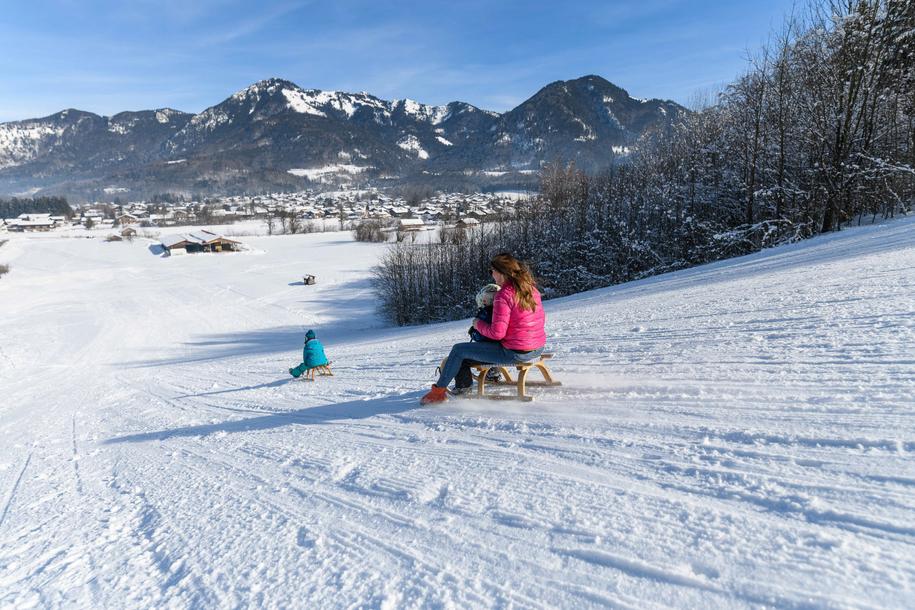 Vom Wanderparkplatz Hochgern zur Agersgschwendt Alm wandern und mit dem Schlitten wieder herunter fahren.