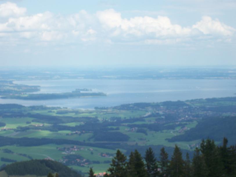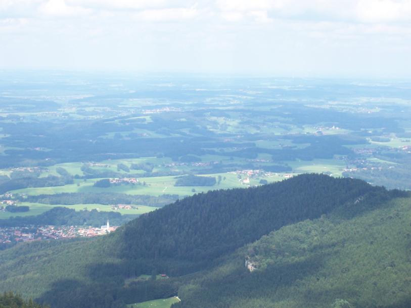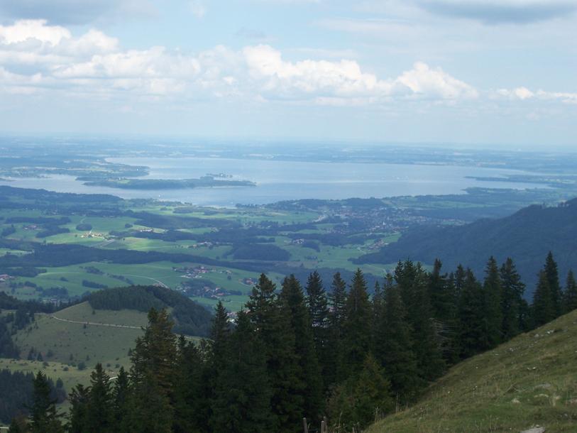 Aussicht: Im Norden der Chiemsee, im Südosten das Zellerhörndl mit Kreuz, jenseits des Tales die Kalksäulen der Kampenwand, im Südwesten der Kamm des Abereck und daran anschließend den Heuraffelkopf mit steilen, felsigen Ostflanken. Der Abstieg erfolgt auf der gleichen Route.