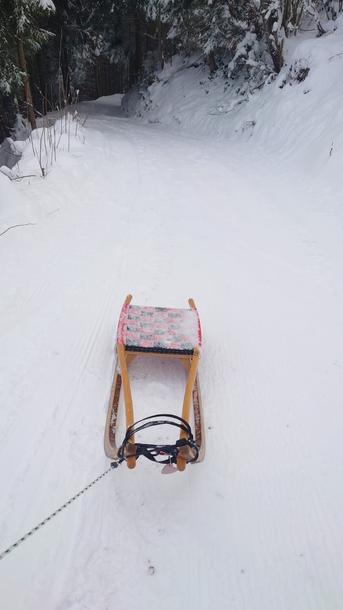 Vom Wanderparkplatz Hochgern zur Agersgschwendt Alm wandern und mit dem Schlitten wieder herunter fahren.