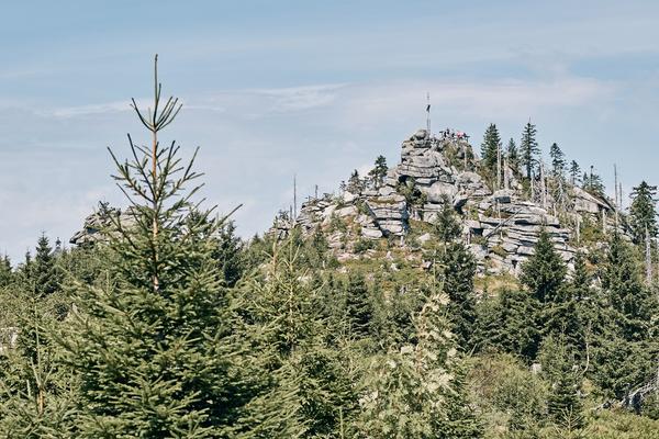 Wer auf dem Gipfel des Großen Falkenstein übernachten möchte, dem steht noch der ca. 7 km lange Anstieg mit etwa 600 Höhenmeter ab Zwieslerwaldhaus bevor. Von hier aus sind schon Ziele des nächsten Etappentages, wie der Große Arber, zu sehen.